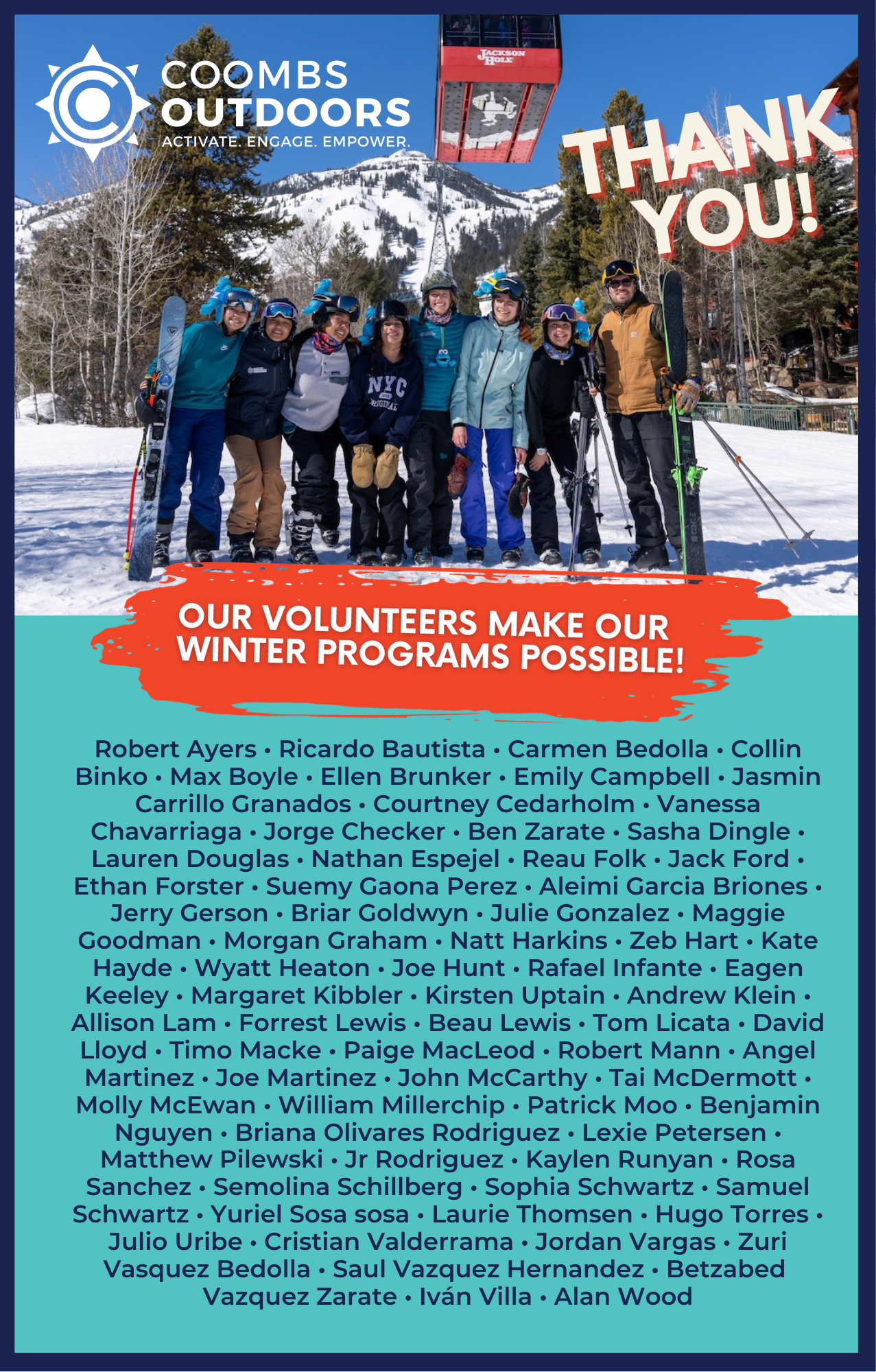 This year has been full of growth for both our winter participants and Coombs alumni taking on new roles as coaches and volunteers. One of our favorite things about programs is that they don't always end once you graduate. This winter we had 12 former participants take roles as volunteer mentors in Coombs Club and backcountry club. These volunteers excelled as role models and advocates, inspiring younger participants to find belonging and seek out adventure on the slopes.